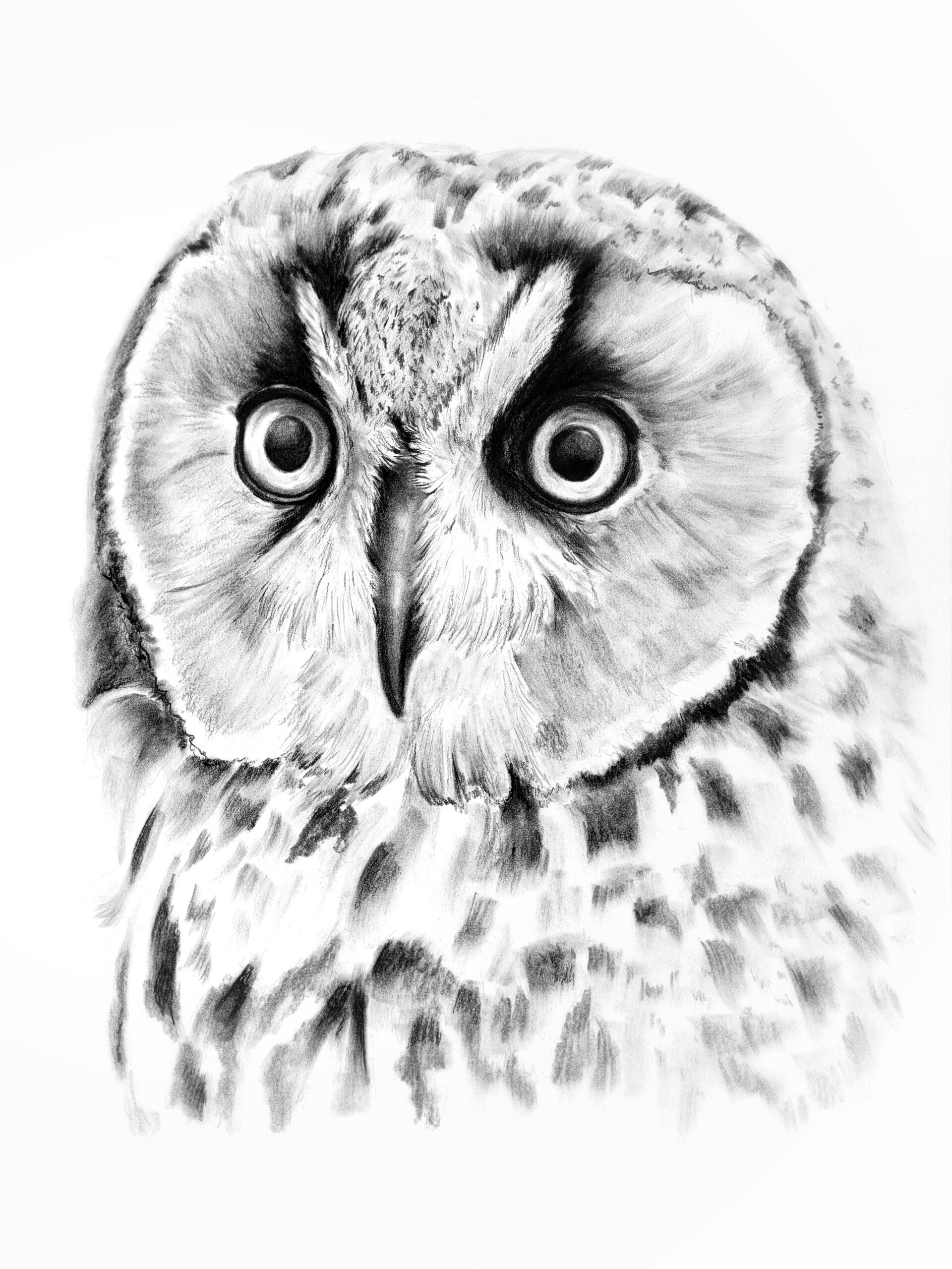 Zacht - portret van een velduil in houtskool