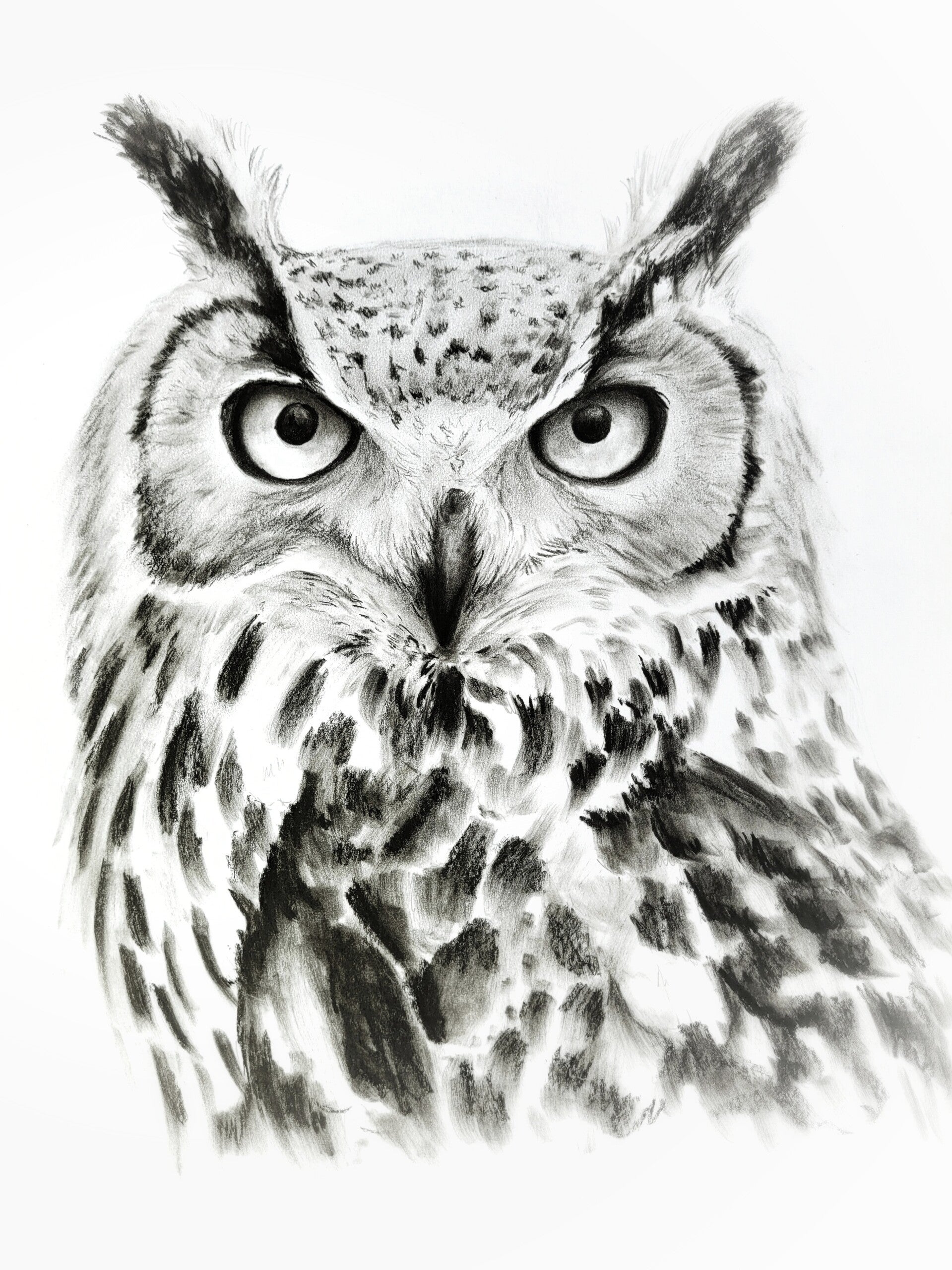 Streng - portret van een oehoe in houtskool