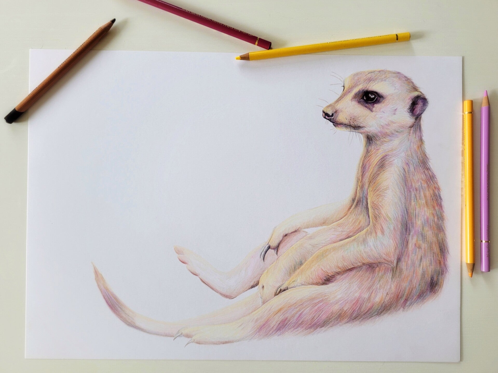 2023 is het jaar van experimenteren! Een van de nieuwe media die ik uitprobeerde was kleurpotlood. Ik gebruikte kleurpotlood al af en toe in mijn schetsboek of om wat detail aan te zetten in een aquarel, maar nooit eerder maakte ik een hele tekening met kleurpotlood. Omdat ik vooral veel felle en niet zozeer natuurlijke kleuren heb, besloot ik regenboogdieren te maken: dieren met alle kleuren van de regenboog!