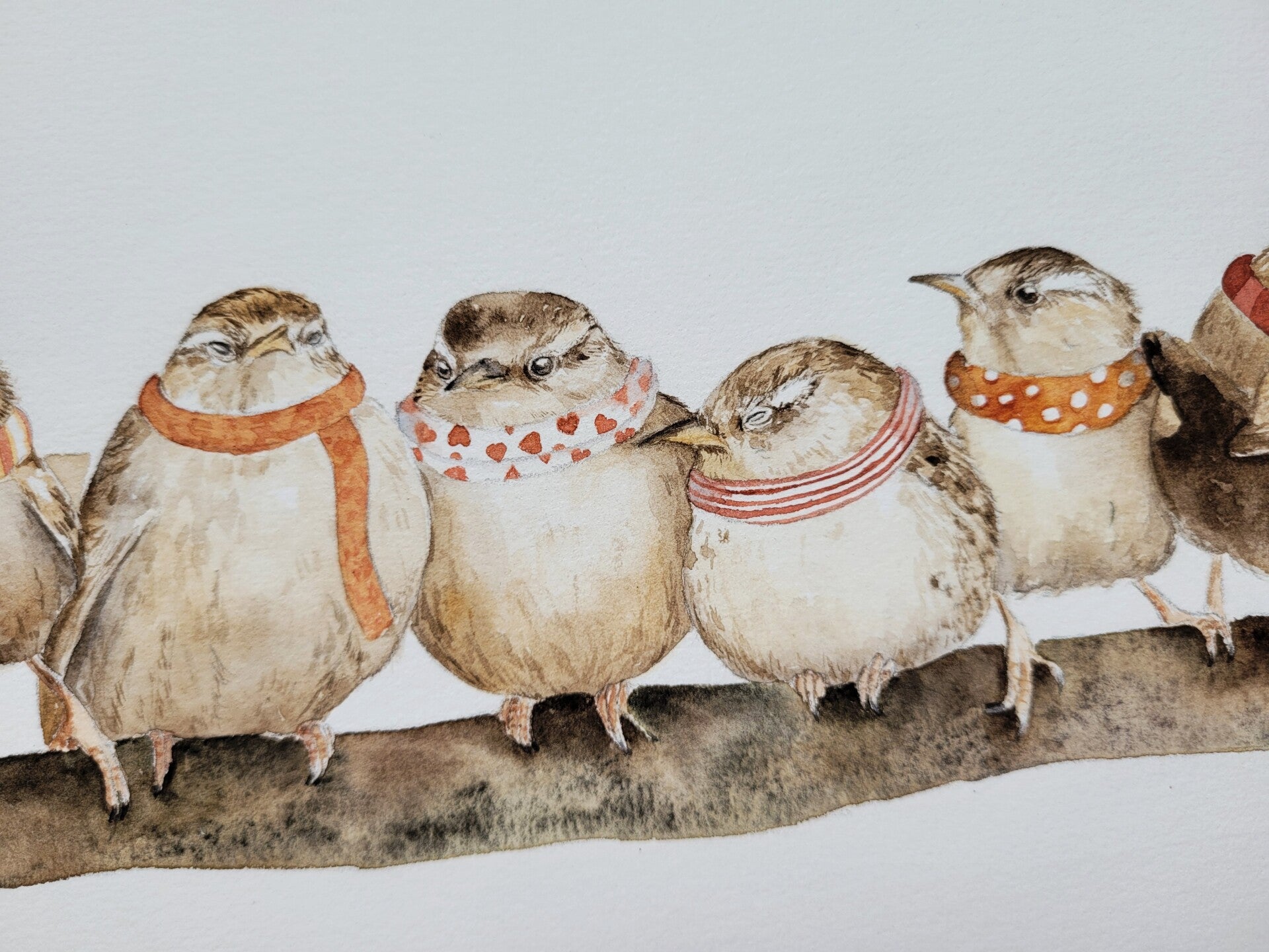 Deze serie van vogeltjes met sjaaltjes schilderde ik in 2022 voor mijn kerstkaarten.