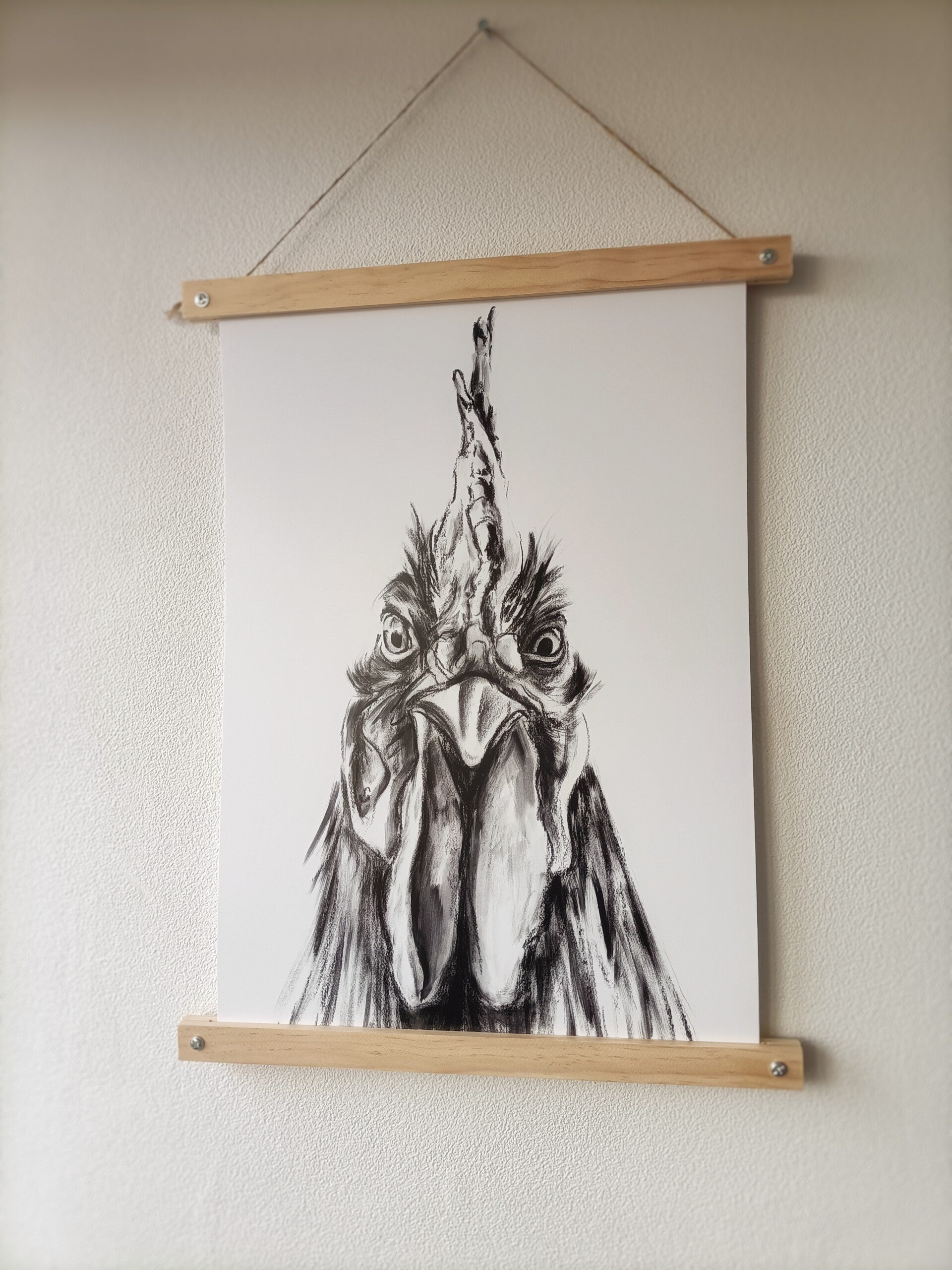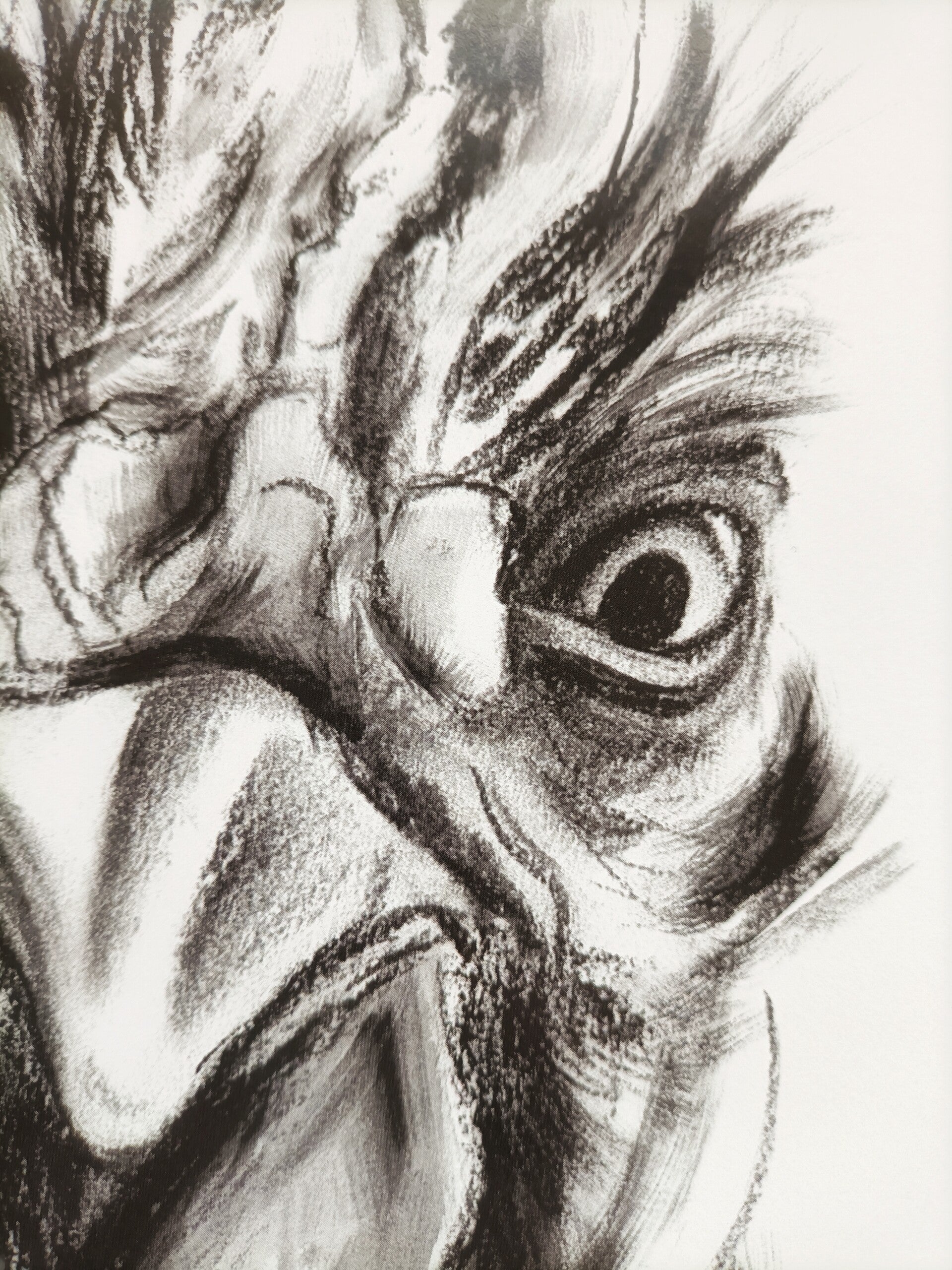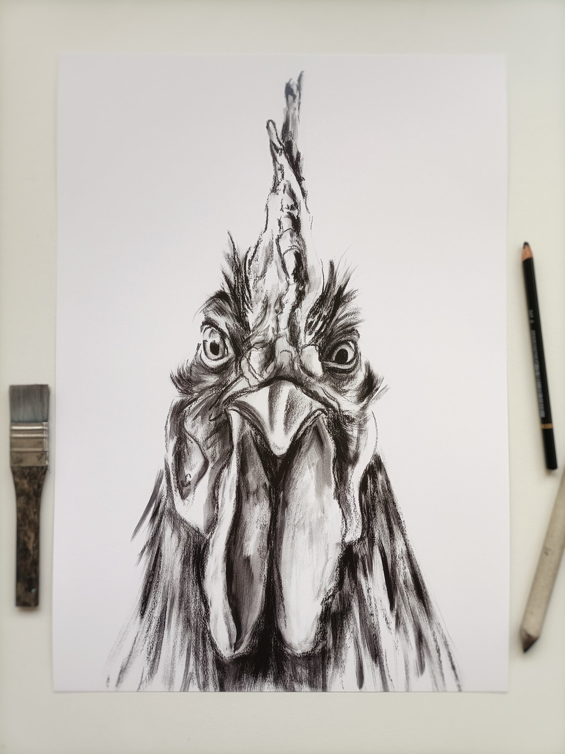 In 2023 experimenteerde ik met een hoop verschillende media. Een daar van was houtskool. Deze haan tekende ik op groot formaat. Het origineel vind je hier.