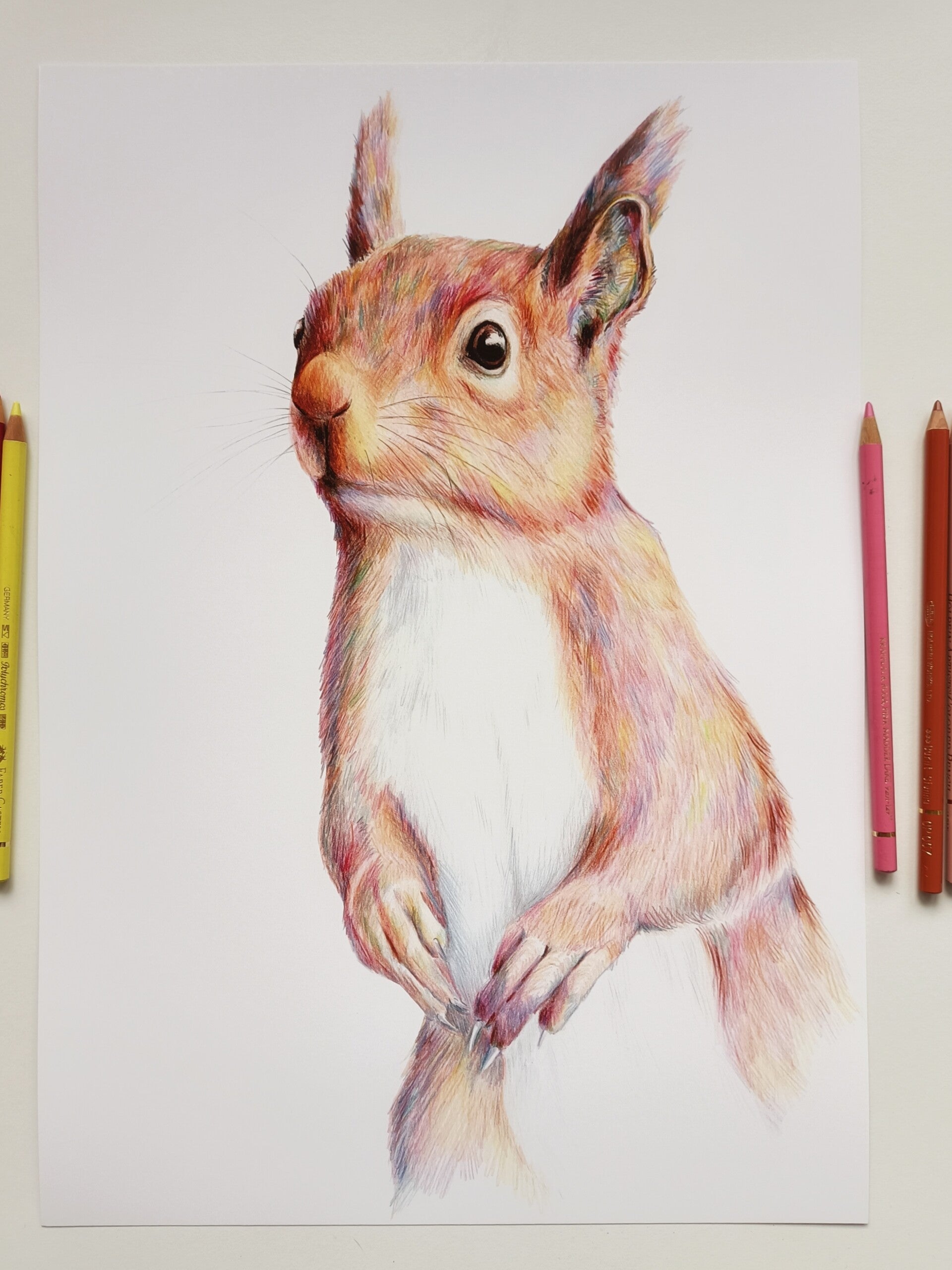 In 2023 experimenteerde ik met een hoop verschillende media. Een daar van was kleurpotlood. Deze eekhoorn tekende ik met een scala aan kleuren.
