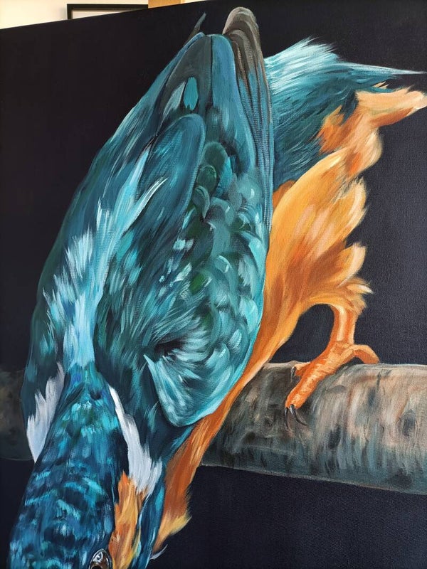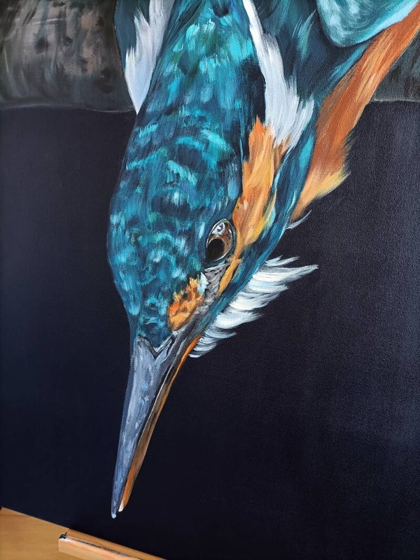 Ik schilderde vooral mijn geliefde ijsvogel. Een aantal doeken vond al gauw een huis. Deze mooie meneer is nog beschikbaar en is een absolute binnenkomer!