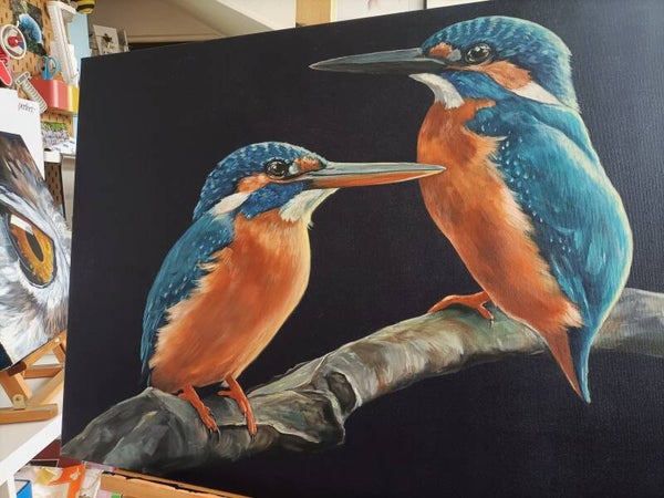 Ik schilderde vooral mijn geliefde ijsvogel. Een aantal doeken vond al gauw een huis. Dit lieve paartje schilderde ik ter ere van mijn huwelijk in februari.