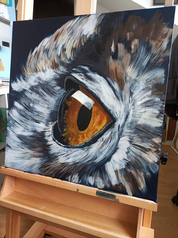 Ik schilderde deze close-up van het oog van een Oehoe. Wat hebben deze dieren machtig mooie ogen!