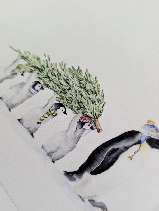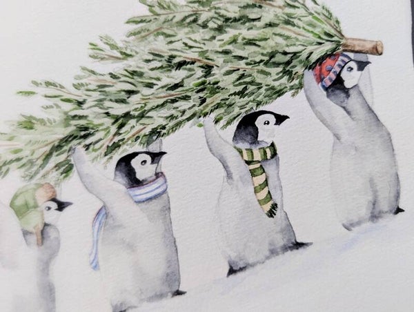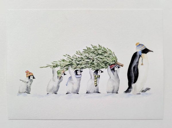 Illustratie pinguins tillen samen een kerstboom