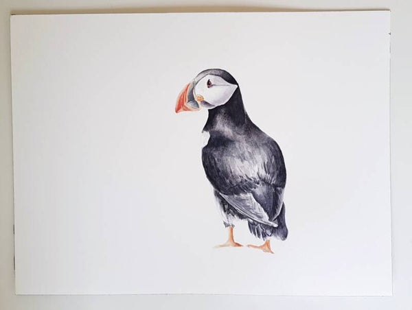 Deze aquarel van een papegaaiduikertje maakt onderdeel uit van de serie "Zee" die ik in de zomer van 2020 schilderde.
