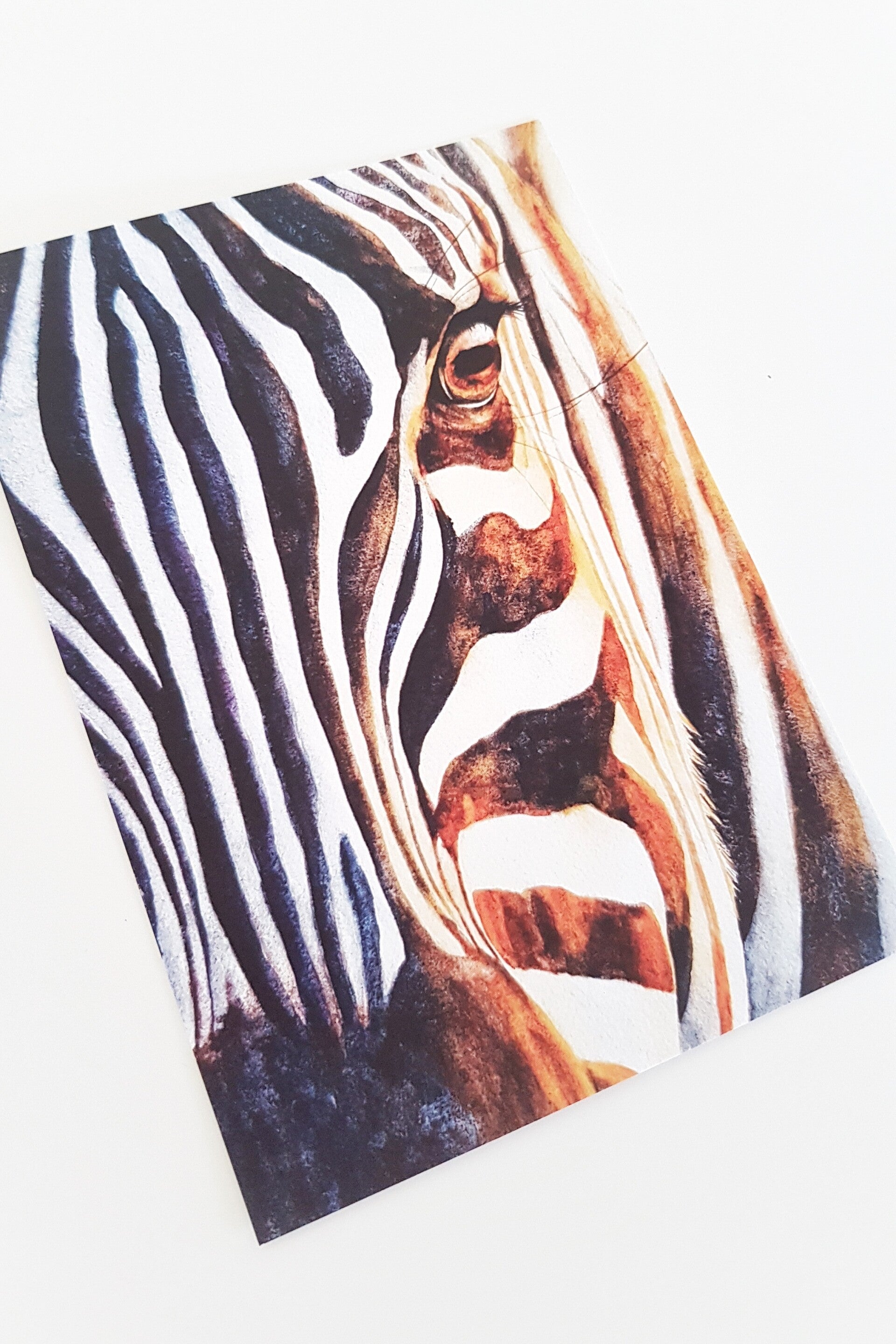 Een ansichtkaart van een zonnige zebra met op de voorkant een mooie aquarelafbeelding en op de achterkant een blanco gedeelte en plek voor adres en postzegel.