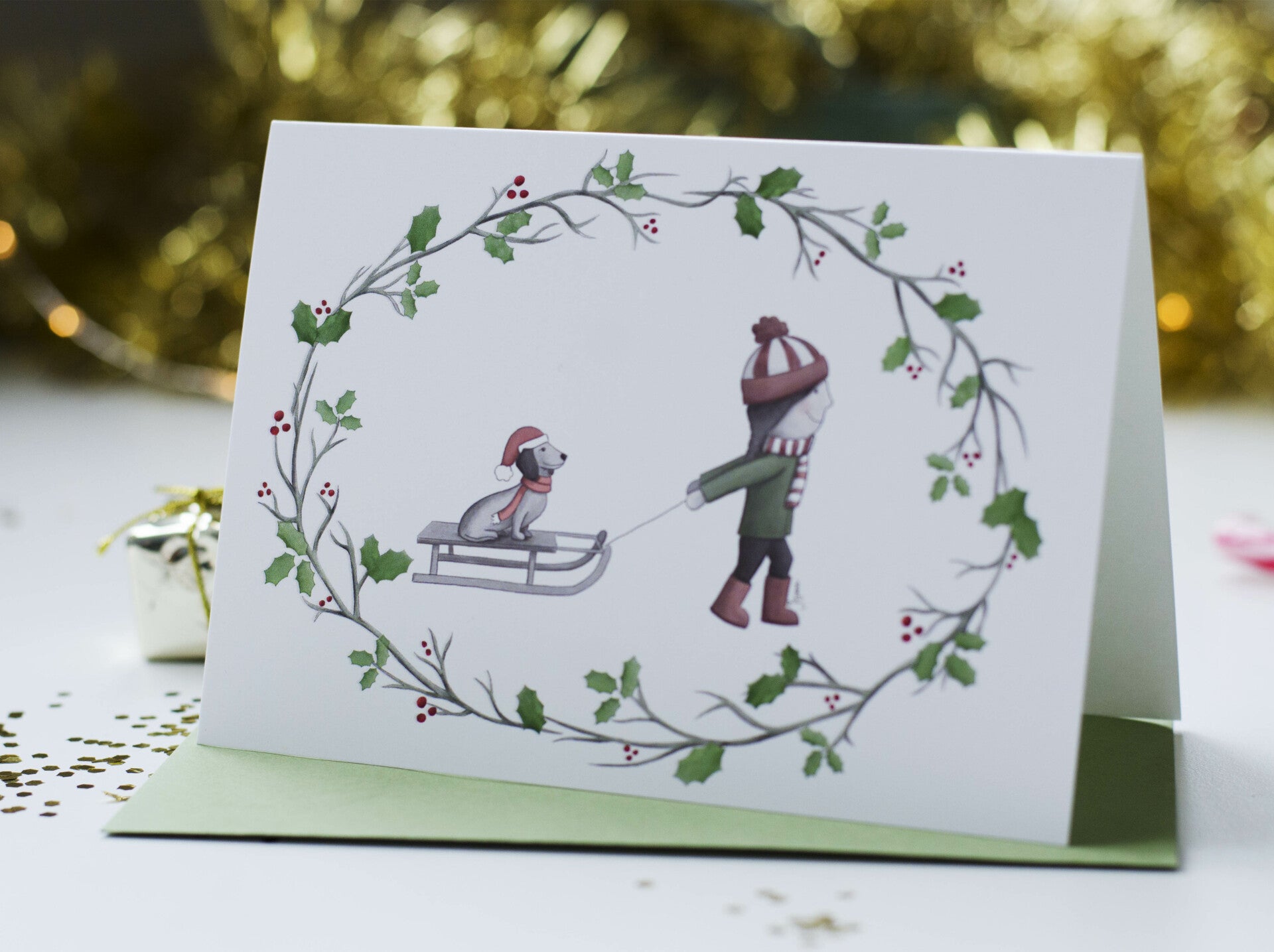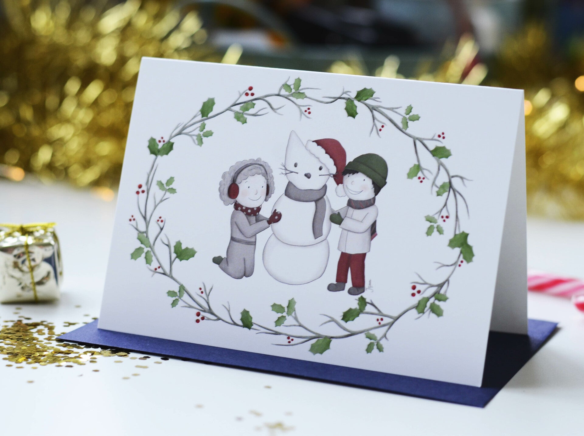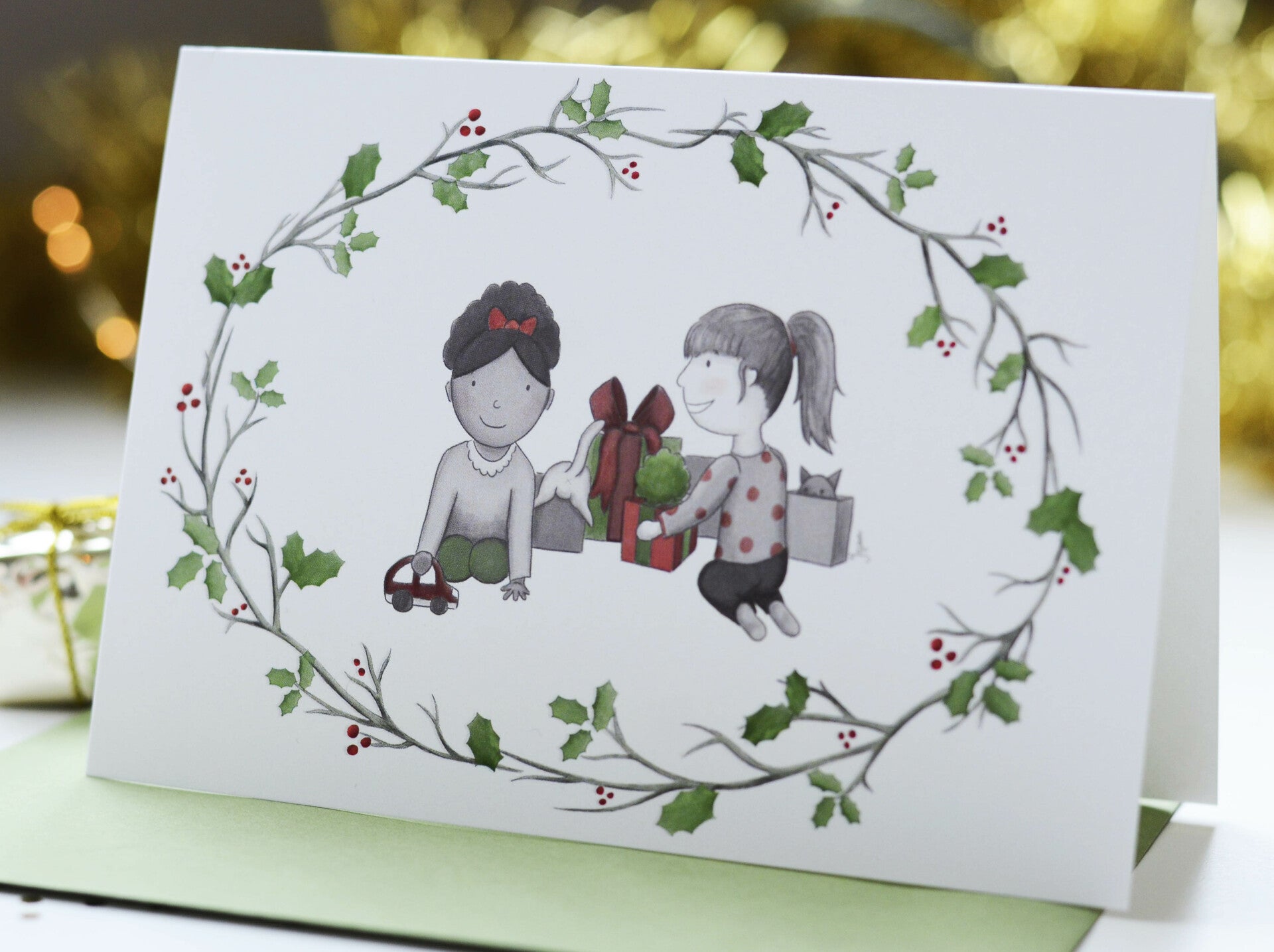 Een aantal jaar geleden maakte ik deze kerstkaarten met schattig geïllustreerde tafereeltjes. De set bestaat uit 5 gevouwen kaarten inclusief enveloppen (kleuren van de enveloppen kunnend afwijken van foto).