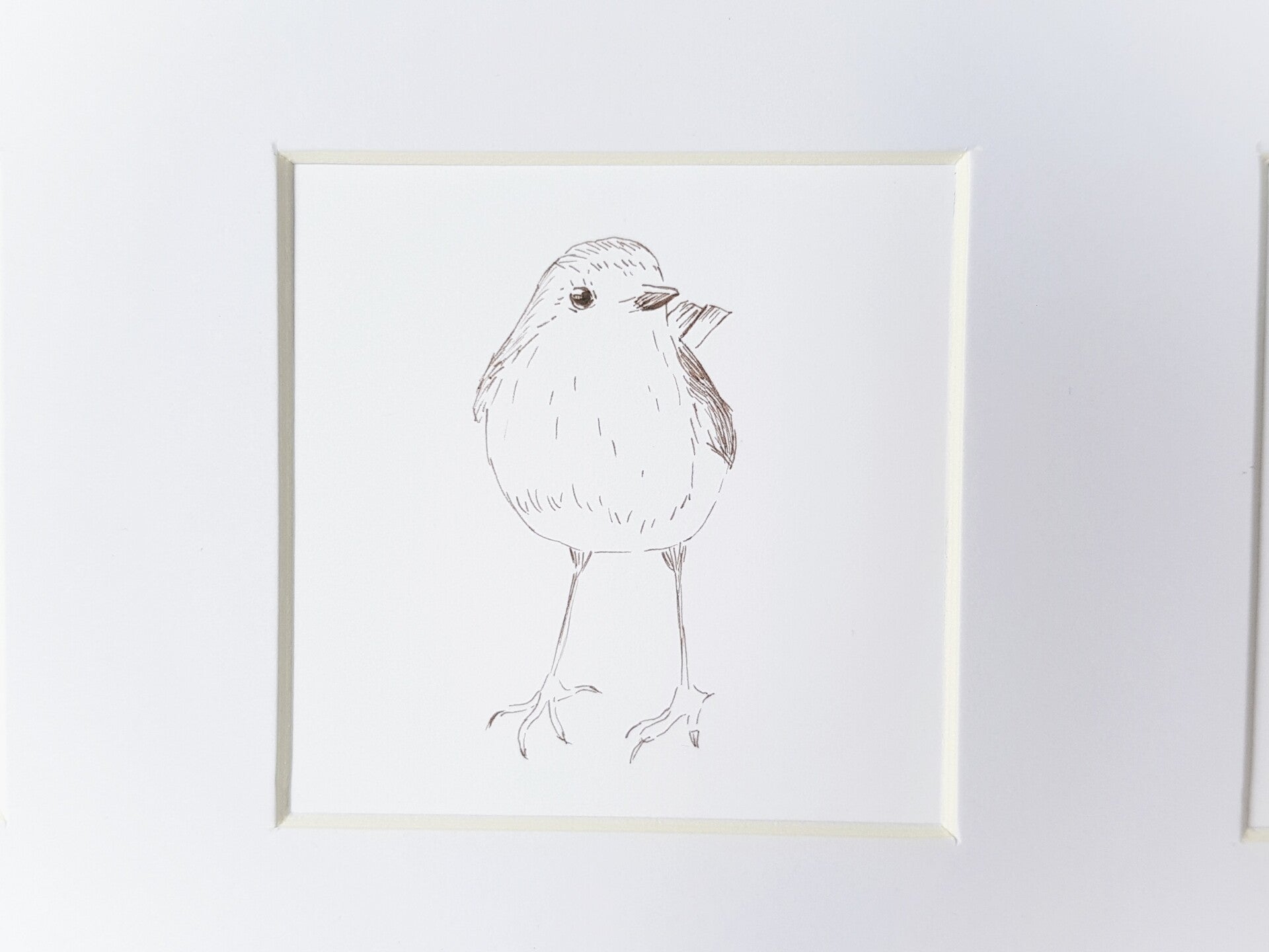 Drie kleine vogeltjes getekend met sepia inkt in een goudkleurig metalen lijstje.