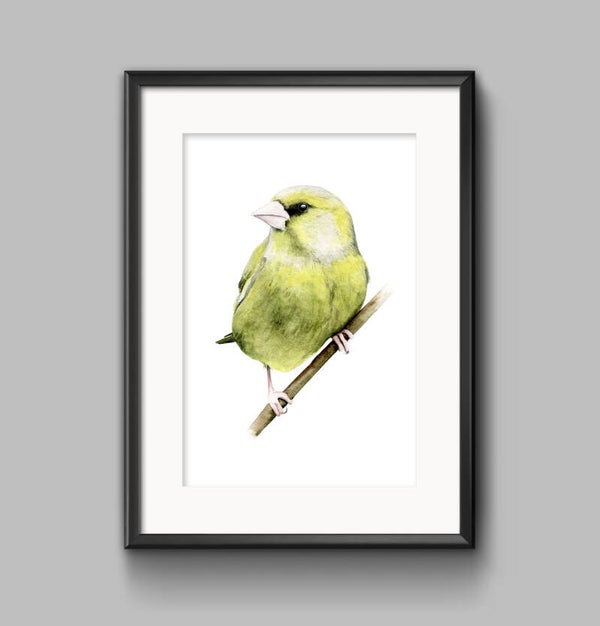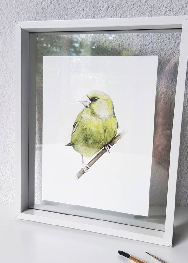 Deze originele aquarel van een groenling maakt onderdeel uit van een persoonlijk project waarbij ik vierentwintig tuinvogels heb geschilderd om ze uiteindelijk samen te brengen tot één grote poster geïnspireerd op oude schoolplaten (je vindt hem hier)