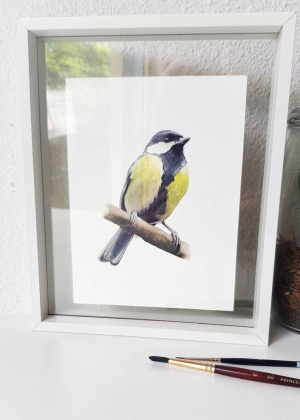 Deze originele aquarel van een koolmeesje maakt onderdeel uit van een persoonlijk project waarbij ik vierentwintig tuinvogels heb geschilderd om ze uiteindelijk samen te brengen tot één grote poster geïnspireerd op oude schoolplaten (je vindt hem hier)