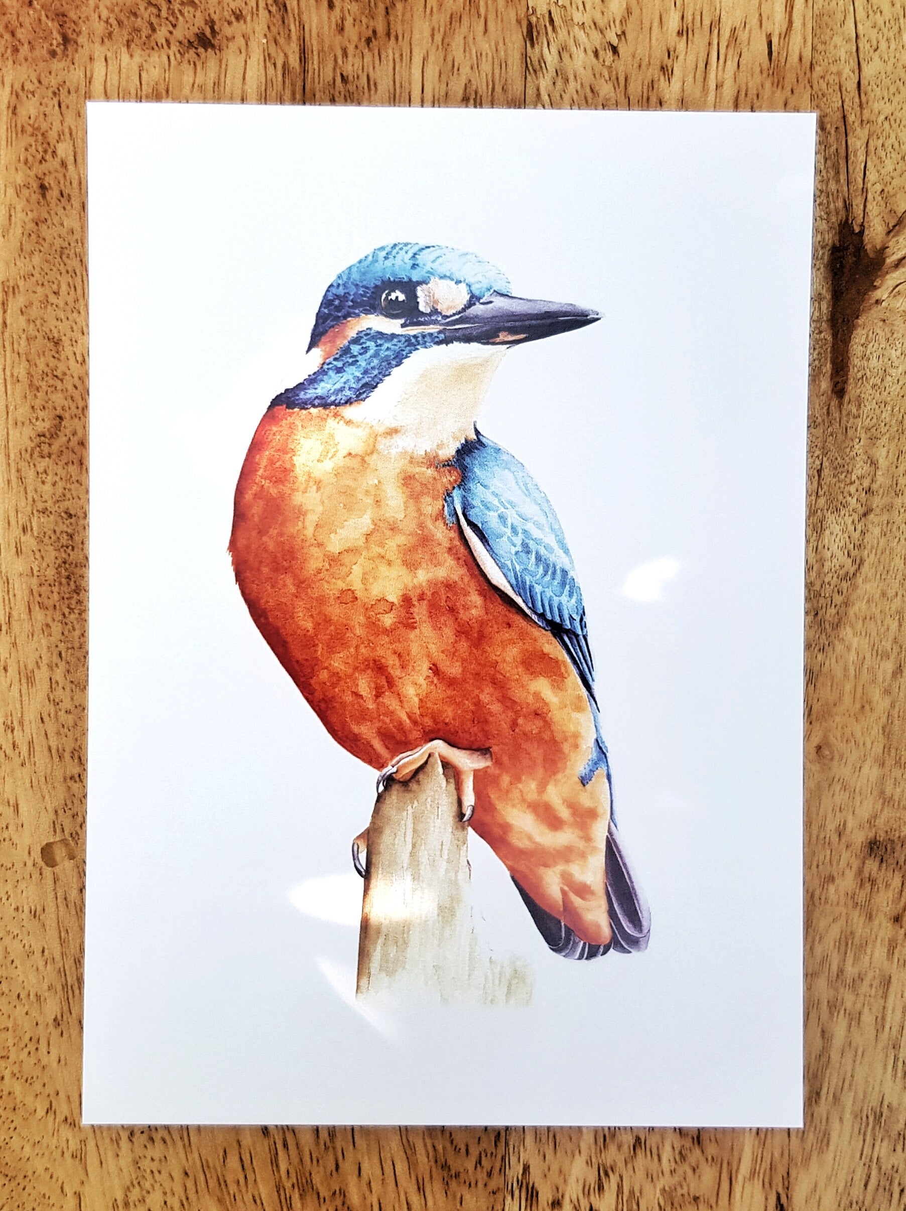 Een ansichtkaart op A6 formaat van een ijsvogel met op de voorkant een mooie aquarelafbeelding en op de achterkant een blanco gedeelte en plek voor adres en postzegel. Alle kaarten zijn gedrukt op stevig 300 gsm eenzijdig gestreken natuurwit karton. Ze zijn niet alleen leuk om iemand via de post blij te maken, maar natuurlijk kun je ze ook in een fotolijstje doen.
