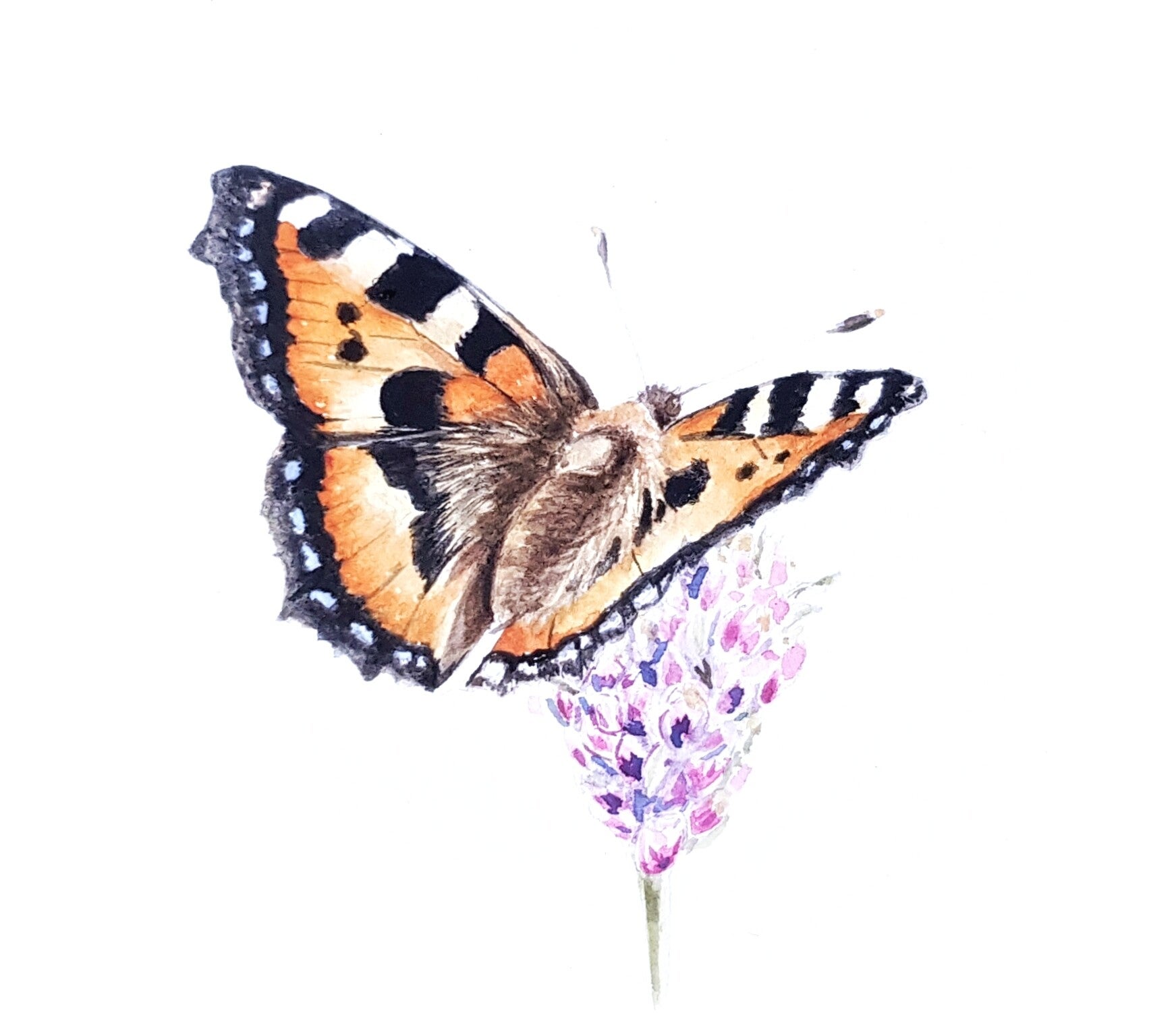 Dit kleine vlindertje op roze bloemen is helemaal klaar om aan je muur te hangen. De aquarel meet 20 x 20 cm en is ingelijst (inclusief wit passe-partout) in een vintage lijstje.