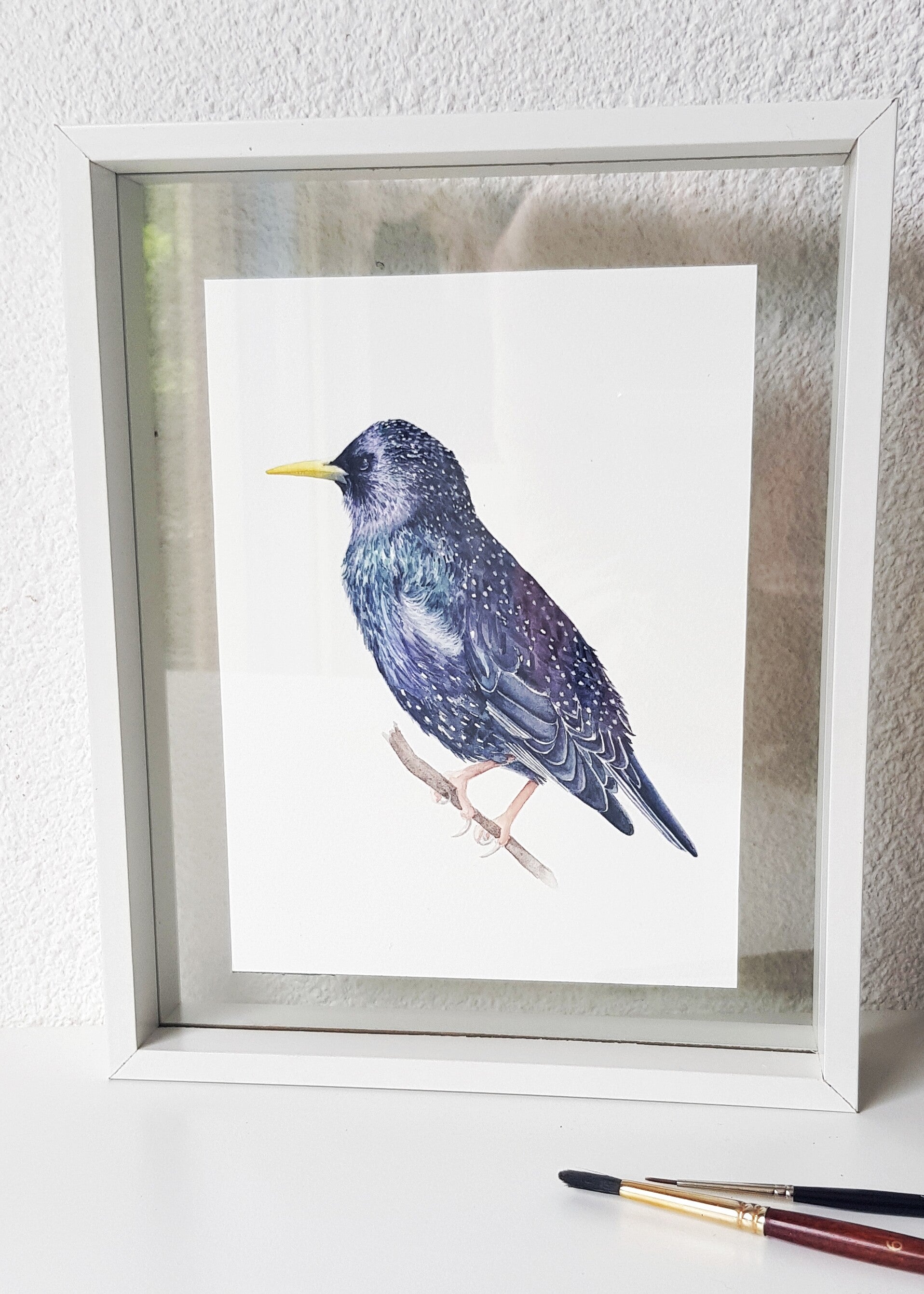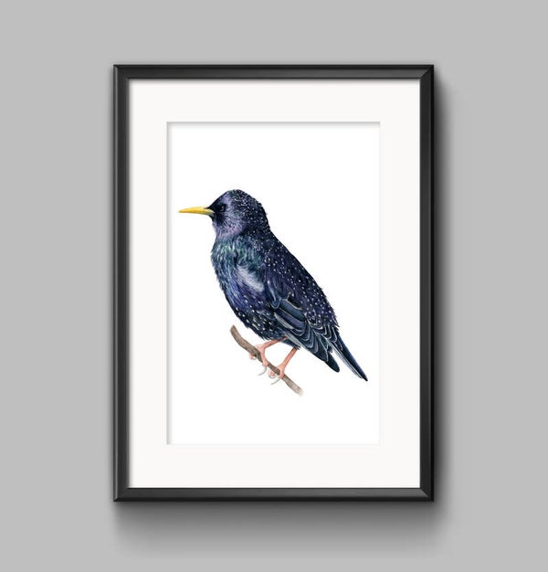 Deze originele aquarel van een spreeuw in de zon maakt onderdeel uit van een persoonlijk project waarbij ik vierentwintig tuinvogels heb geschilderd om ze uiteindelijk samen te brengen tot één grote poster geïnspireerd op oude schoolplaten (je vindt hem hier)