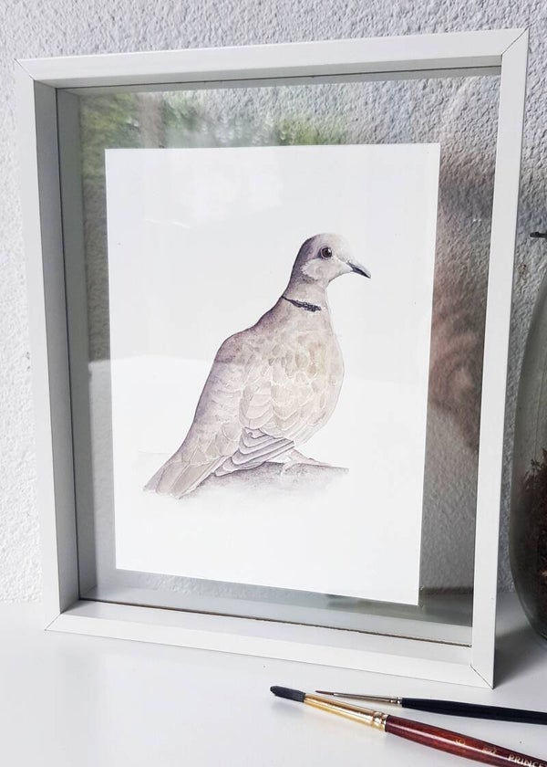 Deze originele aquarel van een Turkse tortel maakt onderdeel uit van een persoonlijk project waarbij ik vierentwintig tuinvogels heb geschilderd om ze uiteindelijk samen te brengen tot één grote poster geïnspireerd op oude schoolplaten (je vindt hem hier)