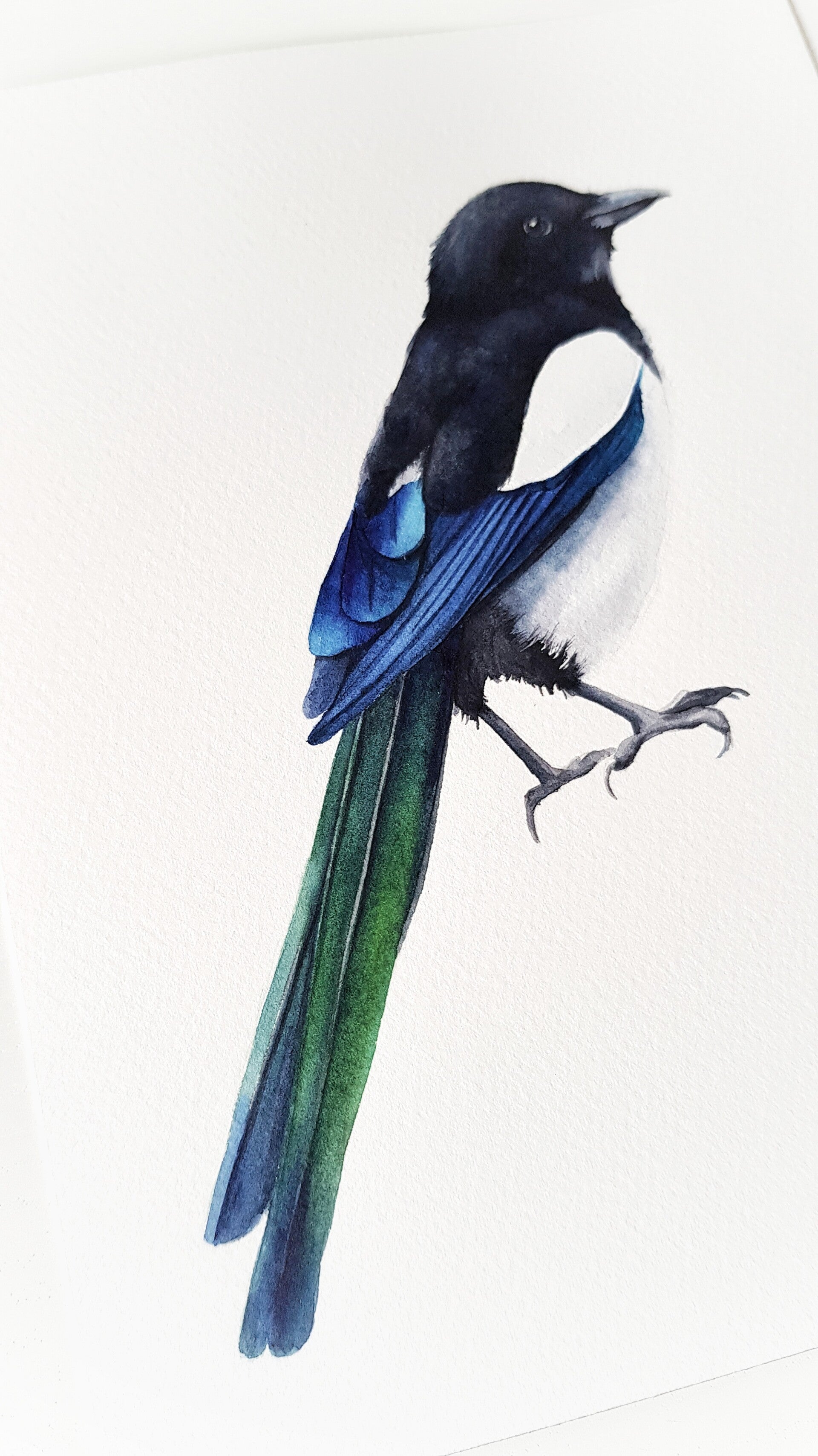 Deze originele aquarel van een ekster maakt onderdeel uit van een persoonlijk project waarbij ik vierentwintig tuinvogels heb geschilderd om ze uiteindelijk samen te brengen tot één grote poster geïnspireerd op oude schoolplaten (je vindt hem hier). Uiteindelijk maakte ik nog een ekster die op de poster kwam te staan.