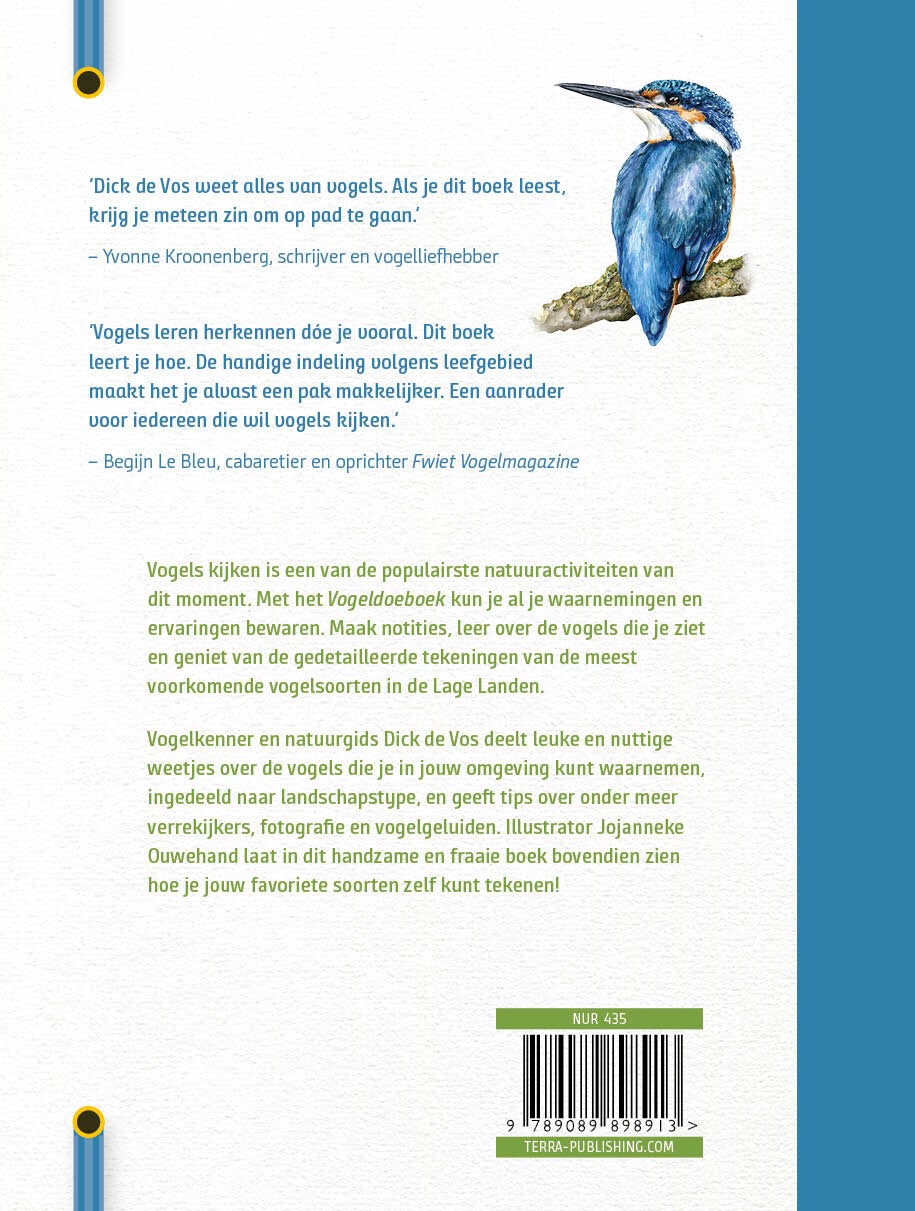 Vogelkenner Dick de Vos deelt leuke maar ook nuttige weetjes over de vogels die je in jouw omgeving kunt waarnemen, ingedeeld op landschapstype; illustrator Jojanneke Ouwehand legt in dit handzame notitieboek ook uit hoe je jouw favoriete soorten zelf kunt tekenen!"