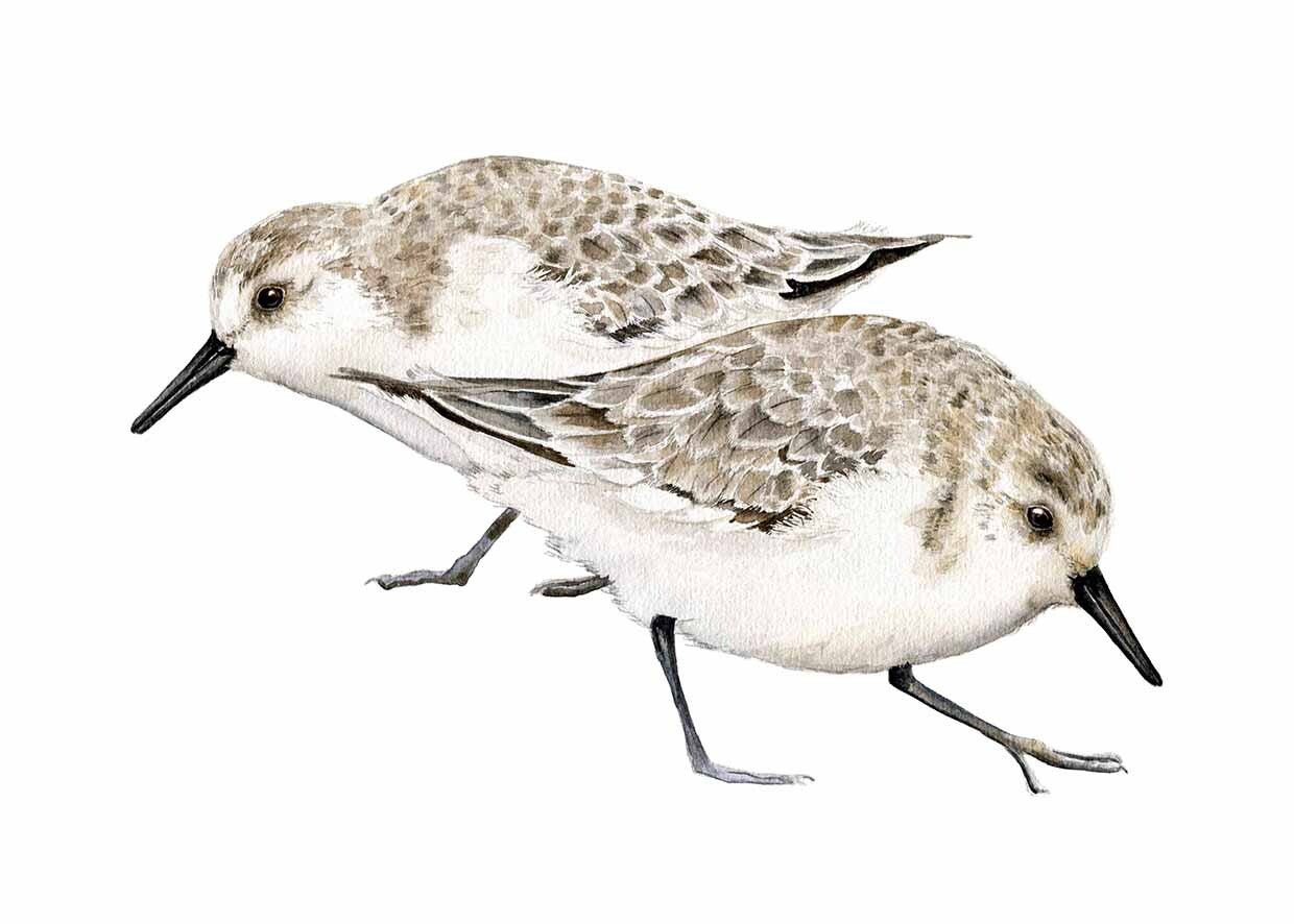 Deze twee strandlopertjes schilderde ik voor het Vogeldoeboek. Het is een van mijn favorieten uit het boek en daarom is hij beschikbaar als giclée.