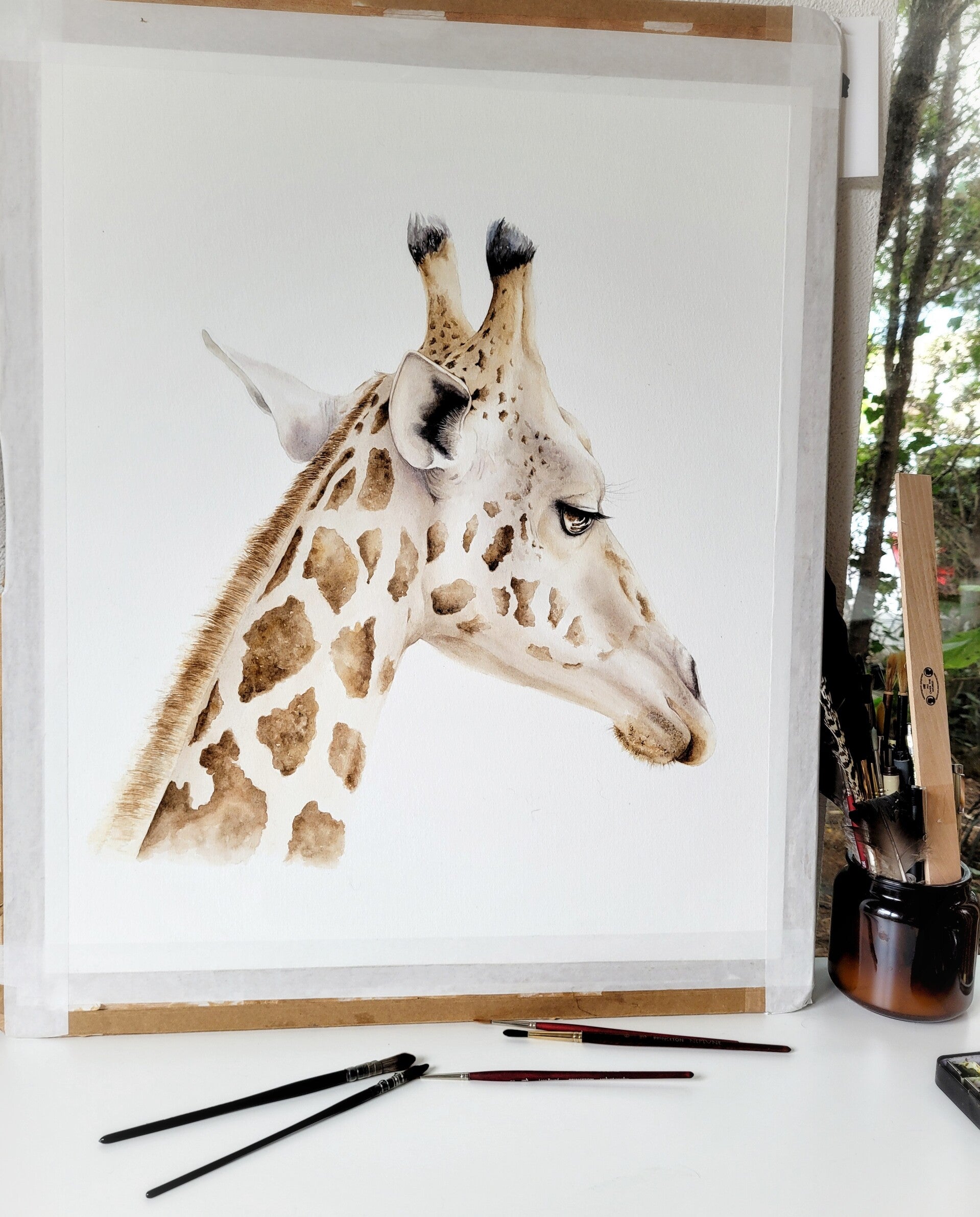 Deze giraf is opgebouwd met wel honderd dunne laagjes verf. Daardoor krijgt ze diepte, maar houdt ze ook haar dromerige karakter.