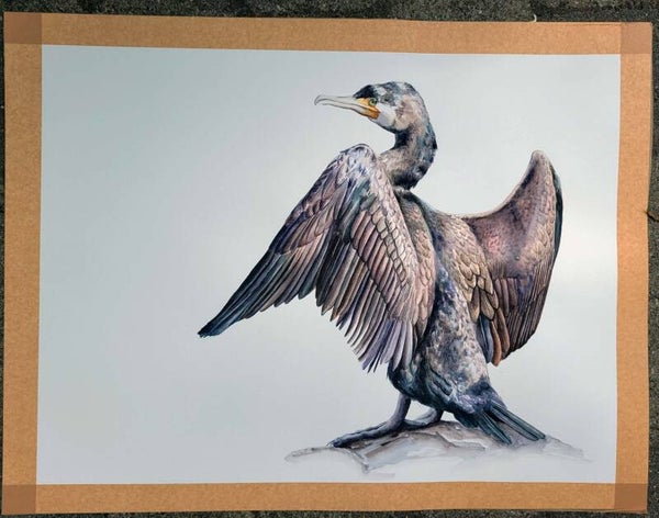 Deze aquarel is op de achterkant voorzien van signatuur en datum. Rond de aquarel zit een rand bruin tape waar ik hem mee opgespannen heb. Dit laat ik er aan zitten zodat je de aquarel mooi kunt inlijsten achter een passe partout.