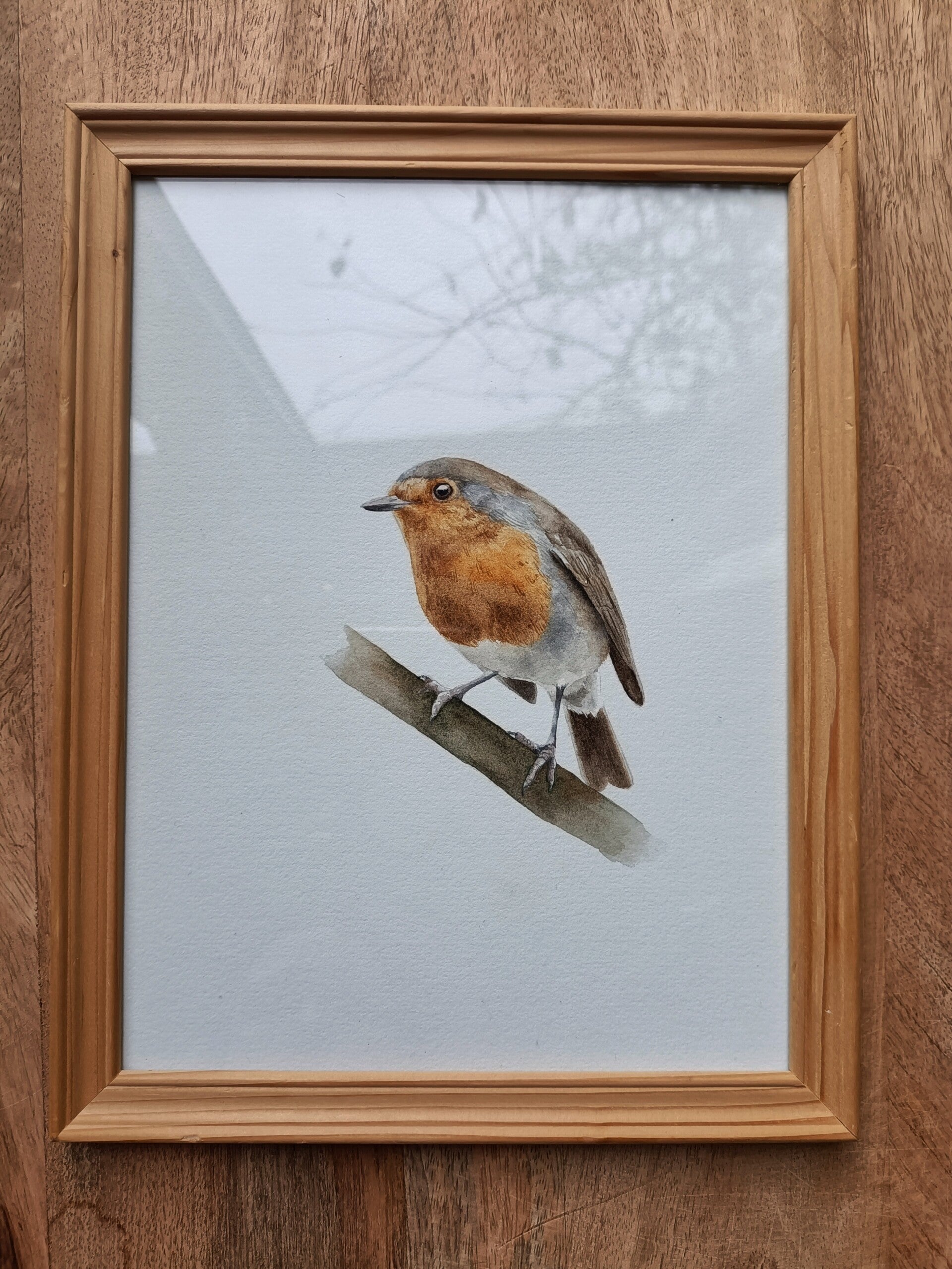 Op zoek mooi cadeau voor jezelf of voor een ander? Speur niet verder! Deze aquarel is helemaal klaar om weg te geven of op te hangen. Dit roodborstje is ingelijst in een leuk vintage lijstje. Let op, het lijstje kan wat gebruikerssporen vertonen!